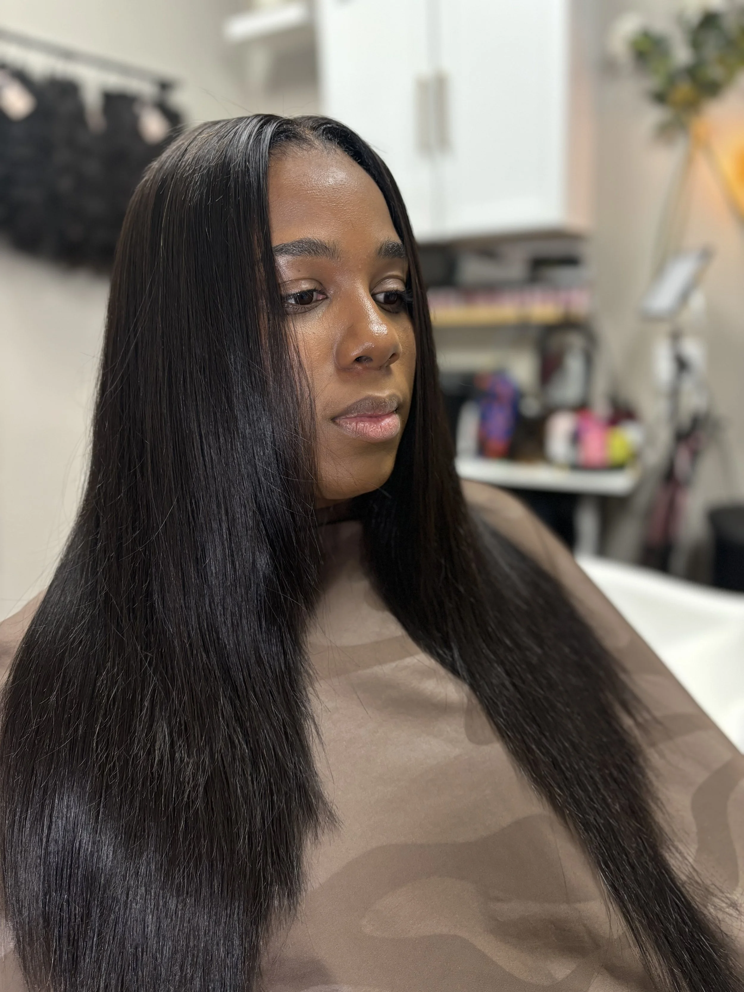 This is NOT a protective style, all hair is left out. Upkeep on this style is 2-4weeks for wash & treatments. Tape ins cannot be moved up, uninstall & reinstall is required ever 6-8weeks.